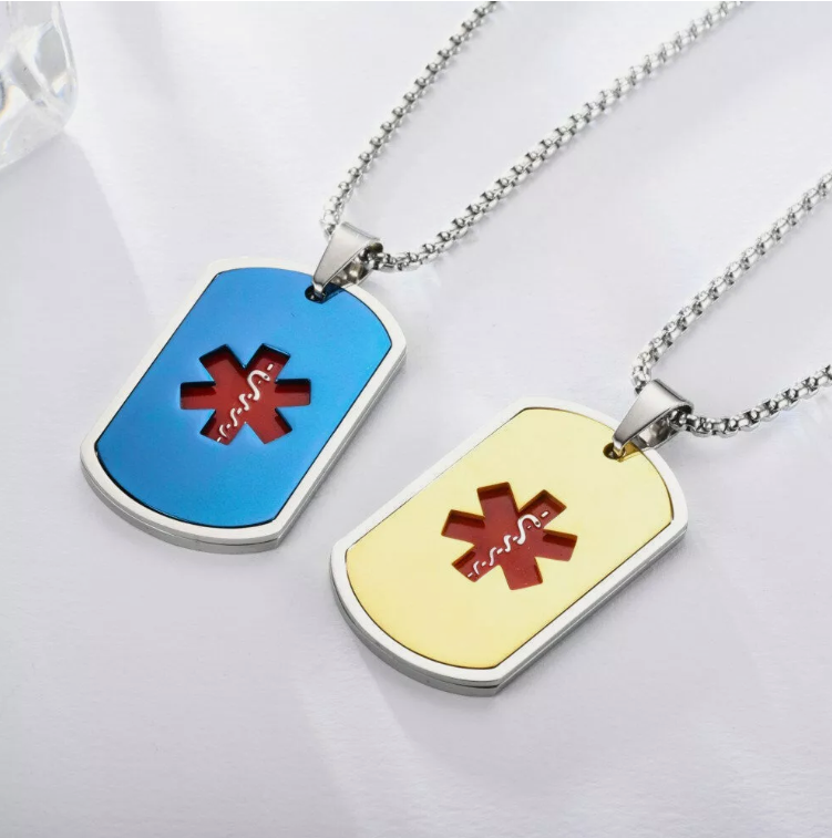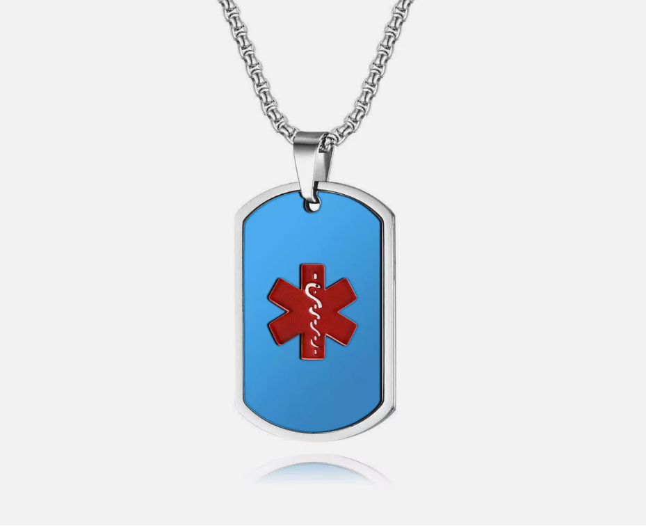 El código MIRPRE® y el texto disponible se encuentran en la parte trasera de esta medalla Estrella de Vida color azul metálico. Disponible para cadenas intercambiables, medalla con símbolo de caduceo médico en rojo. Material de medalla y cadena: acero inoxidable quirúrgico hipoalergénico de alta calidad. Excelente resistencia a la corrosión y duración.