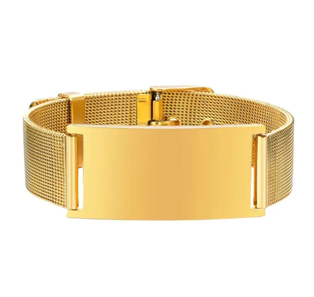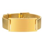 Pulsera de identificación de malla ajustable de acero inoxidable GOLD SLIM de calidad personalizada. Complemente con estilo con esta pulsera de identificación de malla SLIM de color dorado ajustable y de acero inoxidable de calidad personalizada. Este brazalete de identificación de acero inoxidable tiene una banda de malla dorada delgada que se puede asegurar fácilmente.