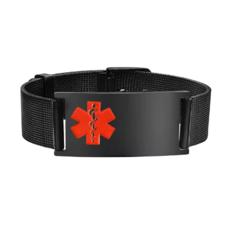 Pulsera de identificación negra de alta calidad con malla ajustable de acero inoxidable ancha parq caballeros. Esta pulsera de identificación de malla ancha de colour negro ajustable hecha a mano en acero inoxidable es una excelente manera de complementar tu estilo. Esta pulsera de identificación de acero inoxidable presenta una banda de malla ancha negra para hombres.