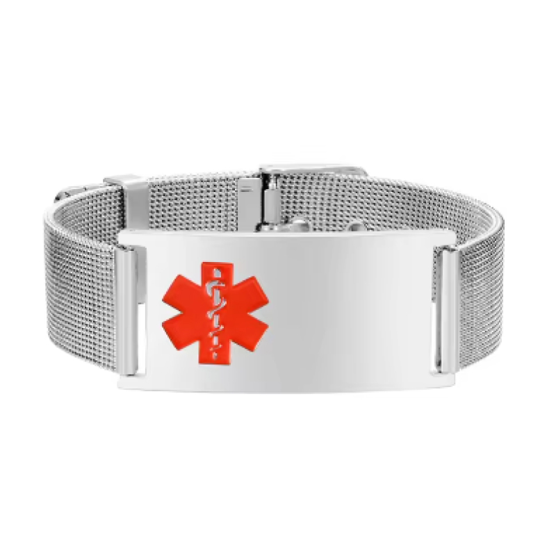 Pulsera de identificación de malla ajustable de acero inoxidable plateado de calidad personalizada con símbolo médico rojo. Esta identificación de malla ANCHA ajustable y personalizada de acero inoxidable plateado con símbolo rojo es una excelente manera de complementar su estilo.