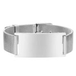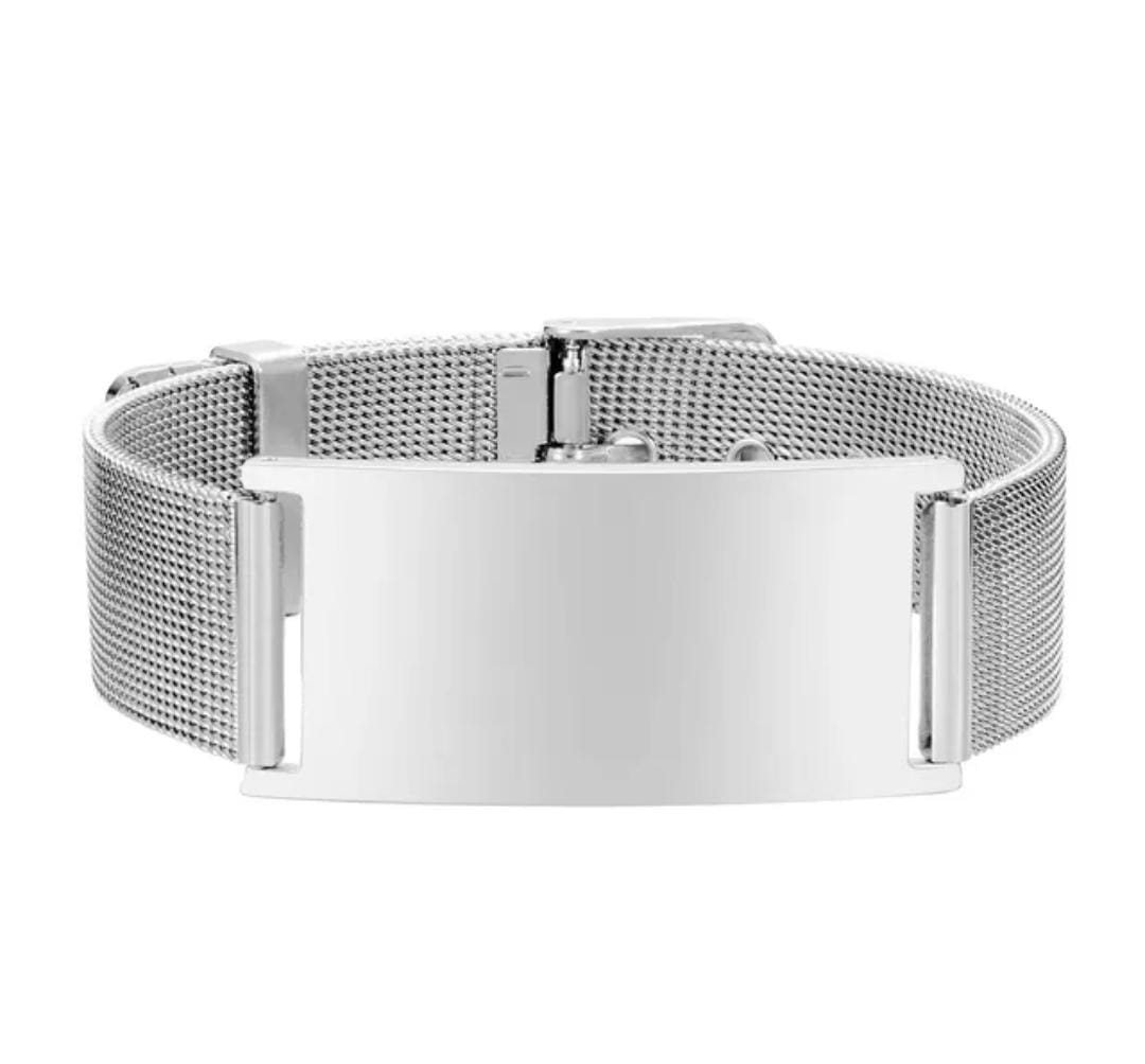 Pulsera de identificación de malla ajustable fabricada a mano en acero inoxidable plateado de alta calidad. Complemente con estilo con esta pulsera de identificación de malla ANCHA ajustable de acero inoxidable de calidad personalizada en color plateado. Este brazalete de identificación de acero inoxidable presenta una banda de malla plateada.