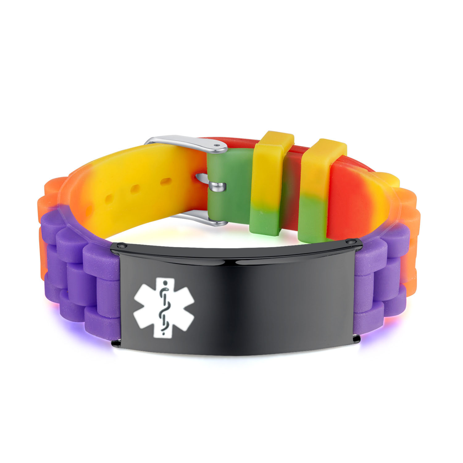 ● Modernas, clásicas, cómodas, suaves, bien combinadas y resistentes al agua, estas pulseras de identificación médica deportiva de silicona Hip Hop para hombres, mujeres son ideales para cualquier ocasión y todas las edades.