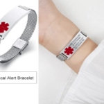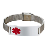 El brazalete de identificación cierre de caja plateado de acero inoxidable tiene un símbolo médico rojo personalizado y una malla ajustable. Esta identificación de malla ajustable de acero inoxidable delgada y de alta calidad personalizada en colour plateado con símbolo rojo será un complemento elegante.