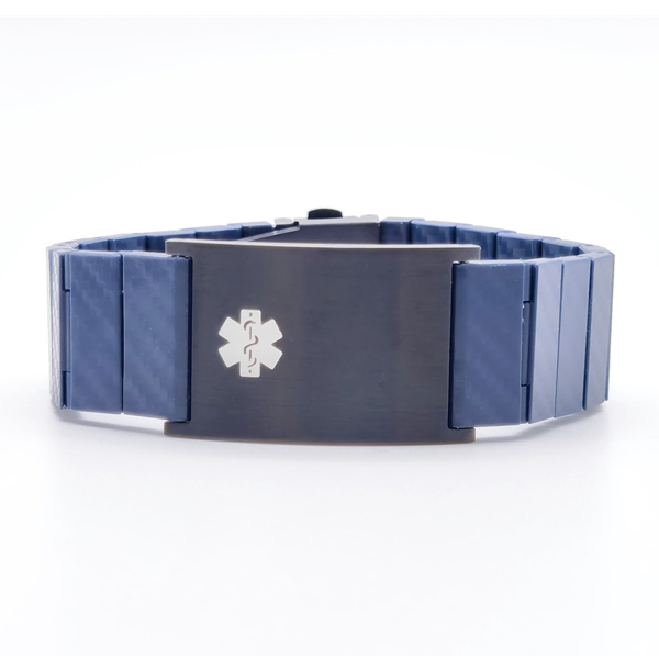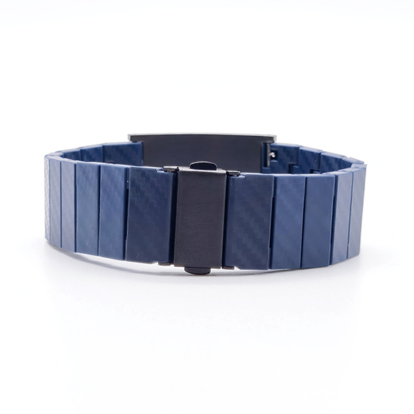 Brazalete de fibra de carbono azul y acero inoxidable negro con símbolo blanco