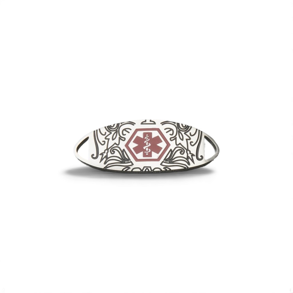 Esta medalla plisada tiene disponible su grabado MiRPRE único solo en la parte trasera. Totalmente personalizable para combinar con todas las tiras de pulseras intercambiables.Símbolo de caduceo médico en rojo.