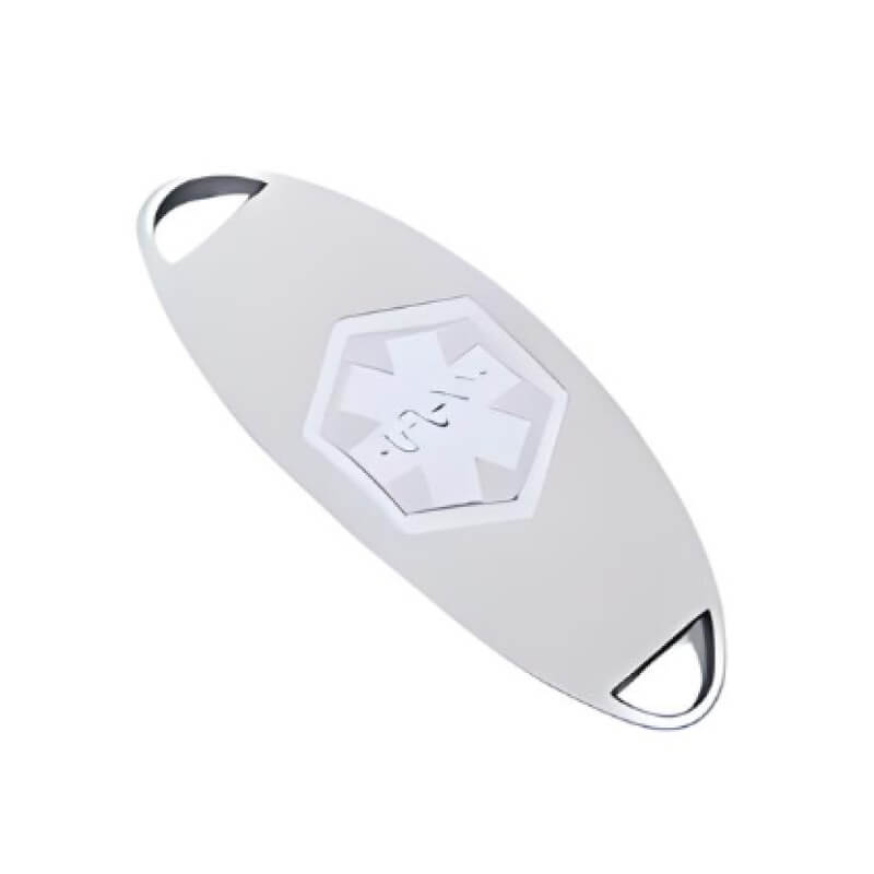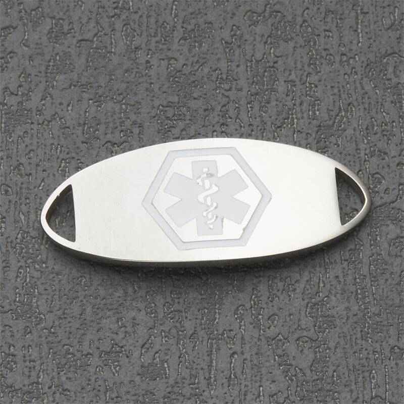 Chapa clasica acero plateado/ blanco Vendido por separado. visite paginas de tiras de pulseras. Esta medalla dorada tiene disponible su grabado MiRPRE único solo en la parte trasera. Totalmente personalizable para combinar con todas las tiras de pulseras intercambiables.Símbolo de caduceo médico en blanco.