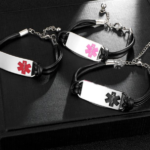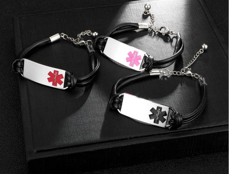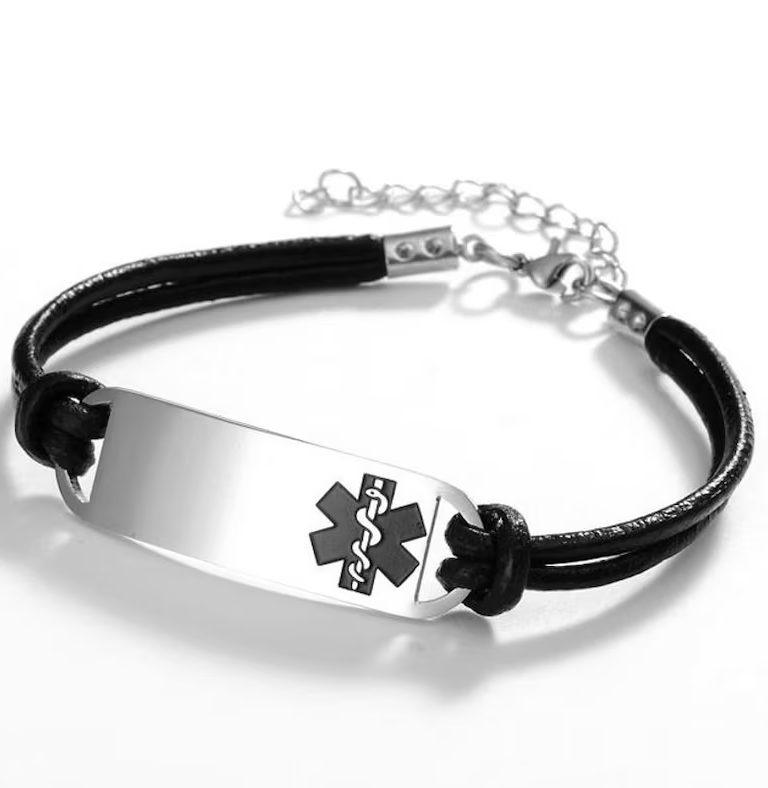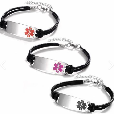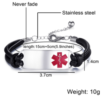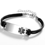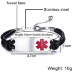 Esta medalla plisada con pulsera cordón de piel tiene disponible su grabado MiRPRE solo en la parte trasera o delantera. Totalmente personalizable para combinar con todas las tiras de pulseras intercambiables.Símbolo de caduceo médico en negro.