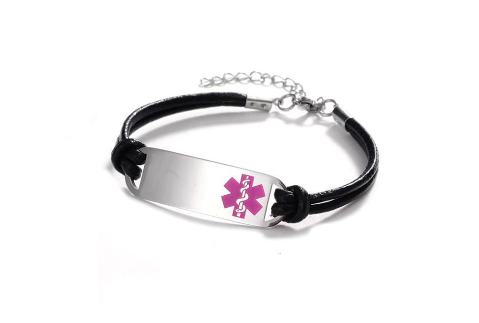 Esta medalla plisada con pulsera cordón de piel tiene disponible su grabado MiRPRE solo en la parte trasera o delantera. Totalmente personalizable para combinar con todas las tiras de pulseras intercambiables.Símbolo de caduceo médico en rojo.