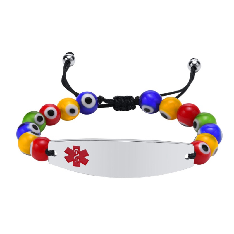 Pulsera de cordón con cuentas turcas de la suerte, colour azul brillante, ojos blancos y negros. y placa de acero inoxidable. Símbolo de caduceo médico en rojo.