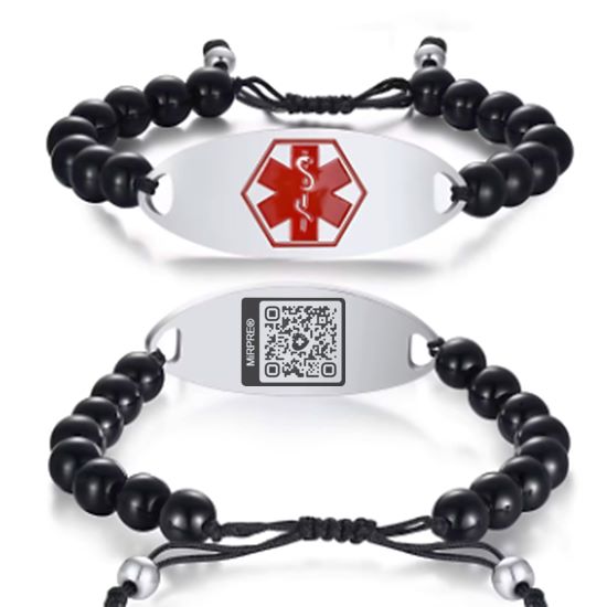 Pulsera de cordón con cuentas de lava negra y placa de acero inoxidable. Símbolo de caduceo médico en rojo. Simples cuentas de piedra de lava negra añaden un toque de sofisticación.