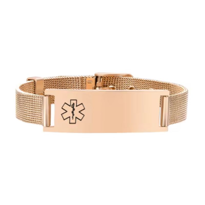 Brazalete de identificación de alta calidad con contorno negro y malla ajustable de acero inoxidable rosa delgada. Esta pulsera de identificación de malla slim ajustable de acero inoxidable personalizada en color oro rosa es una excelente manera de complementar tu estilo. Este brazalete de identificación de acero inoxidable presenta una banda de malla SLIM DE ORO ROSA con un símbolo de contorno negro.