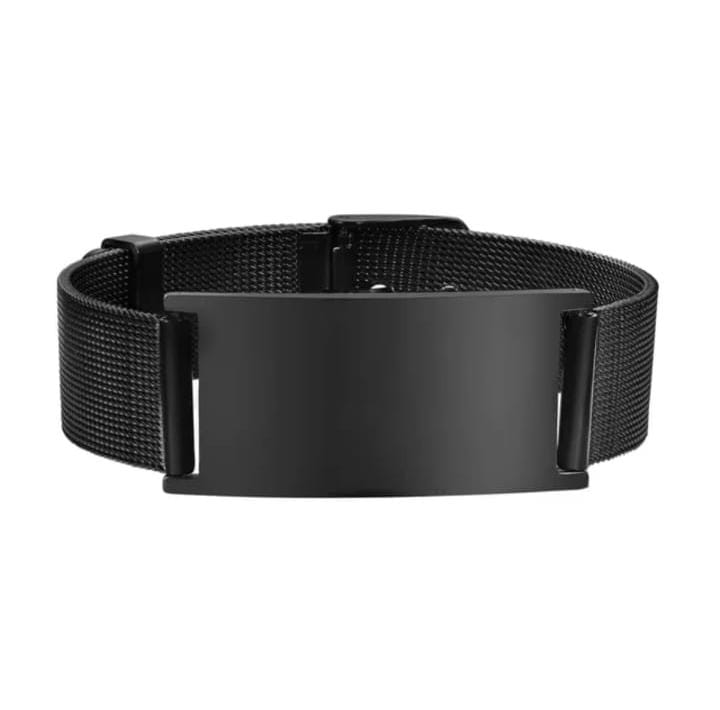 Pulsera de identificación personalizada de acero inoxidable negro slim con malla ajustable. Esta pulsera de identificación de malla slim de colour negro ajustable hecha a mano de acero inoxidable es una pieza elegante para complementar tu look. Esta pulsera de identificación de acero inoxidable presenta una banda de malla delgada negra.