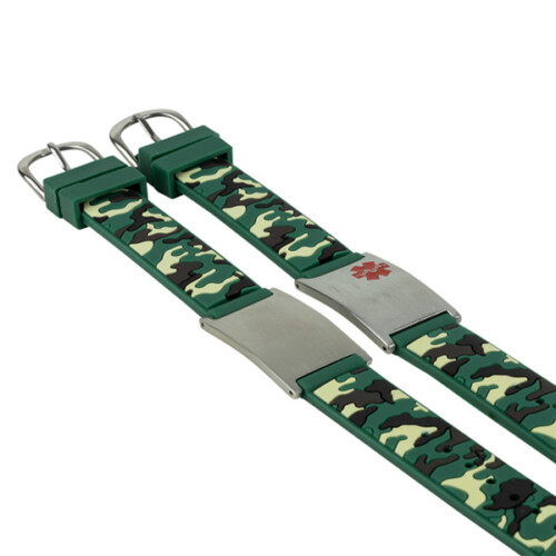 Pulsera de silicona Camuflaje Verde para niños, etiqueta plateada con símbolo rojo