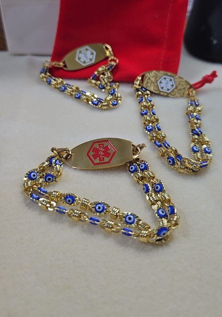 Pulsera intercambiable de ojos turcos en acero inoxidable dorado y placa de acero inoxidable. Símbolo de caduceo médico. Clásicas, modernas, exquisitas y bien combinadas, estas pulseras de identificación médica se adaptan a cualquier ocasión y a todas las edades.