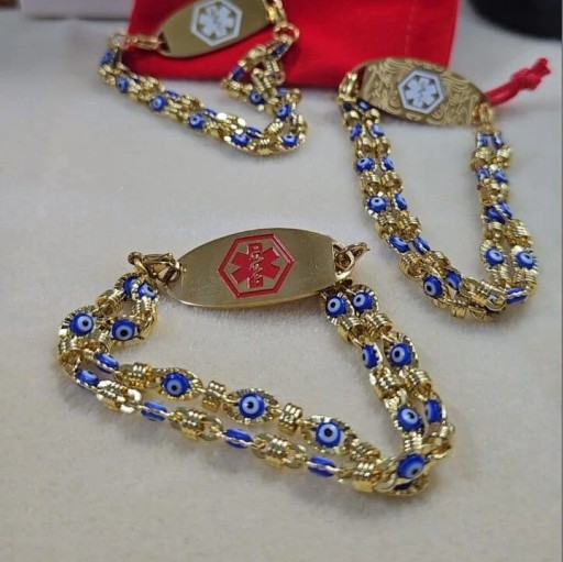 Pulsera intercambiable de ojos turcos en acero inoxidable dorado y placa de acero inoxidable. Símbolo de caduceo médico. Clásicas, modernas, exquisitas y bien combinadas, estas pulseras de identificación médica se adaptan a cualquier ocasión y a todas las edades.