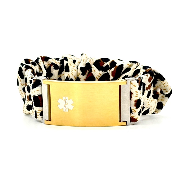 Pulseras de identificación médica de tela elástica Leopardo Scrunchie para la mujer moderna. Deportiva scrunchie también para niños. ● Clásica, moderna, liviana, exquisita, simple y bien combinada, esta pulsera de identificación médica de tejido elástico negro se adapta a todas las edades y cualquier ocasión.