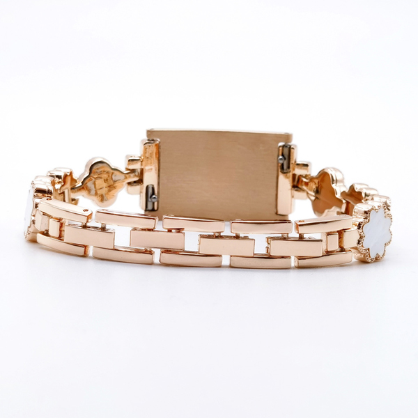 Pulsera trébol de cuatro hojas madreperla en oro rosa con símbolo blanco.